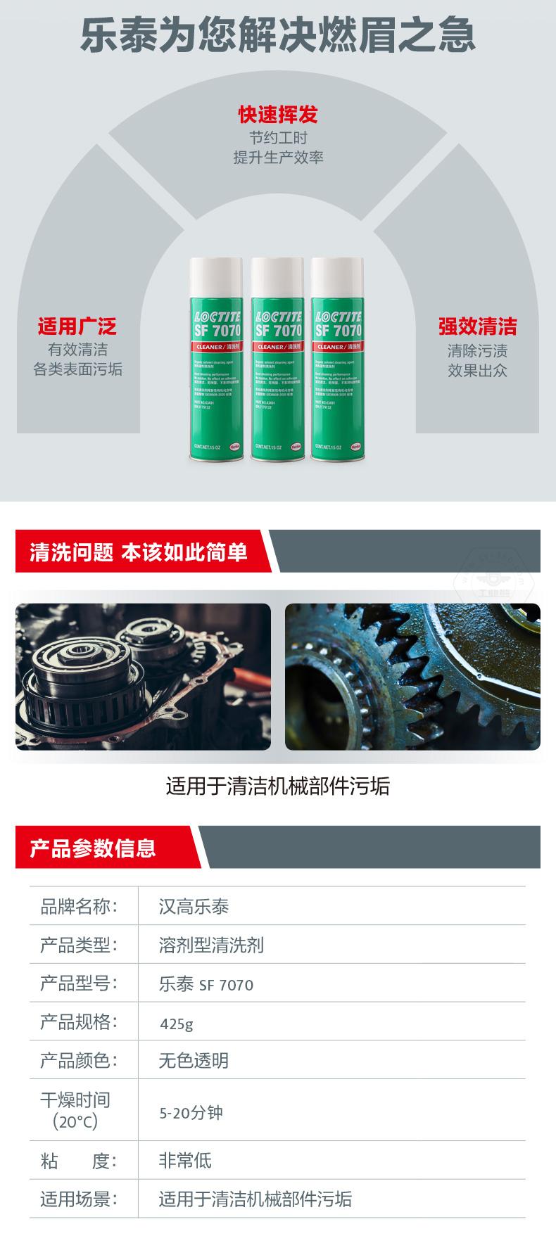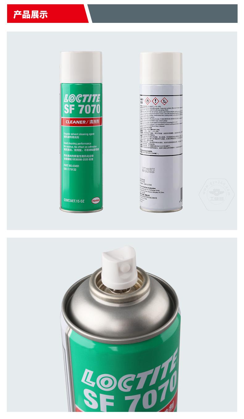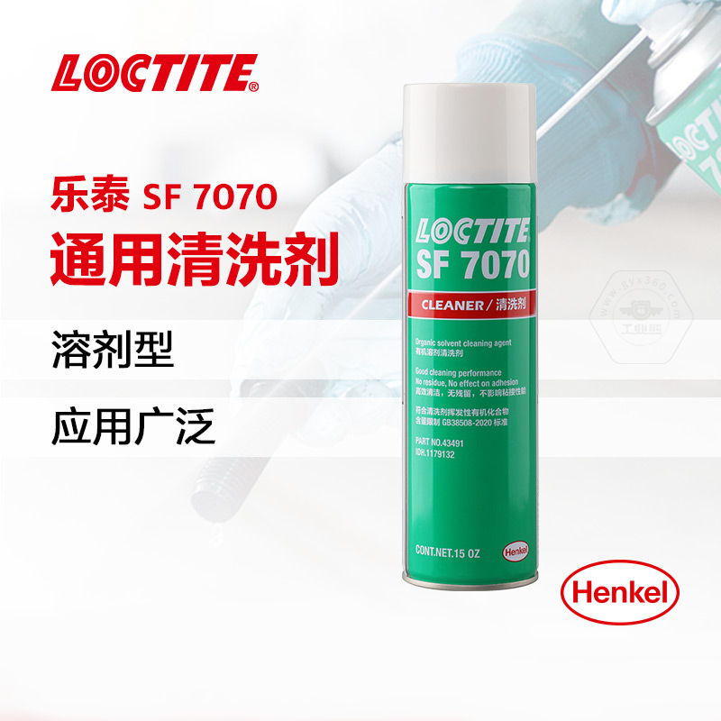 乐泰SF7070是一种无色透明溶剂型(不含氟氯烃的)部件清洗剂和脱脂剂,它经过特别配制,可使部件与胶粘剂粘合。该产品适合在室温下用做喷剂,能去除部件上的大部分油、油脂、润滑液、金属切削液和细粉,可安全用于铝、橡胶和大多数塑料。