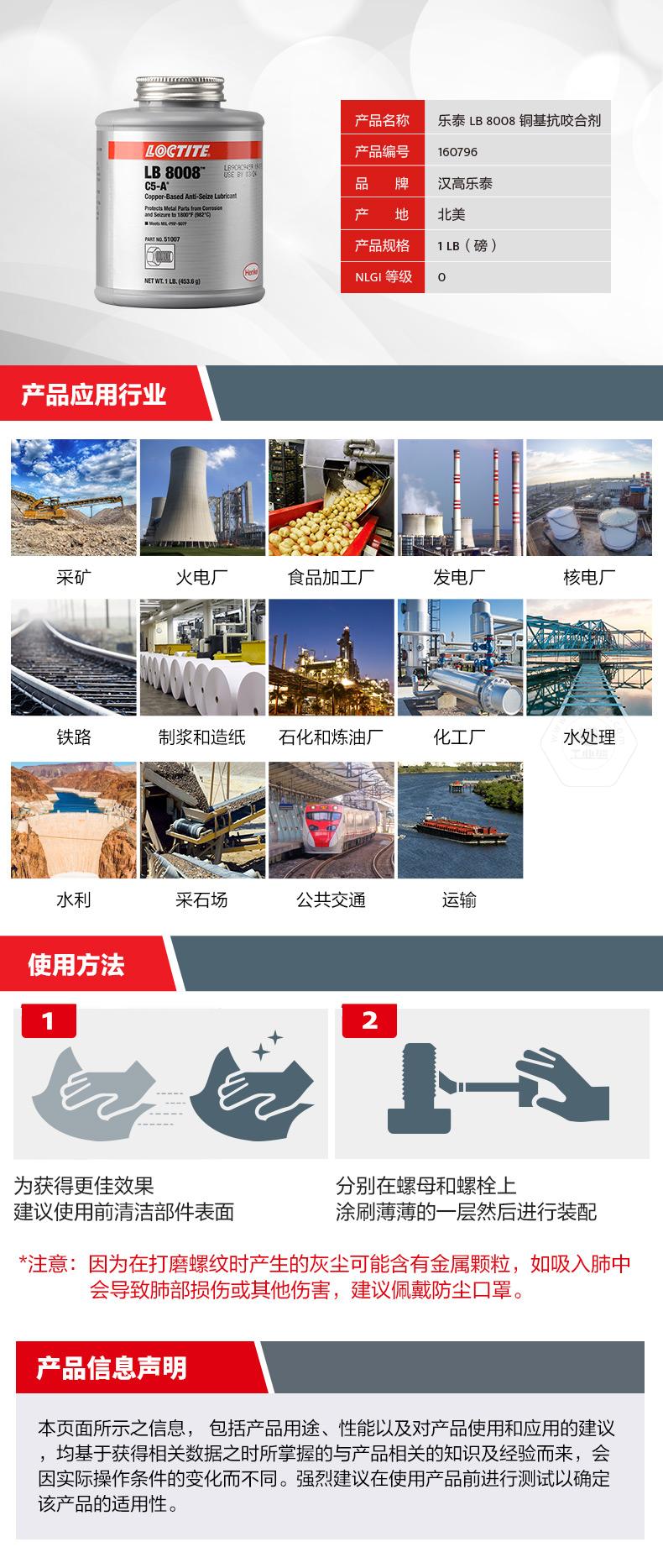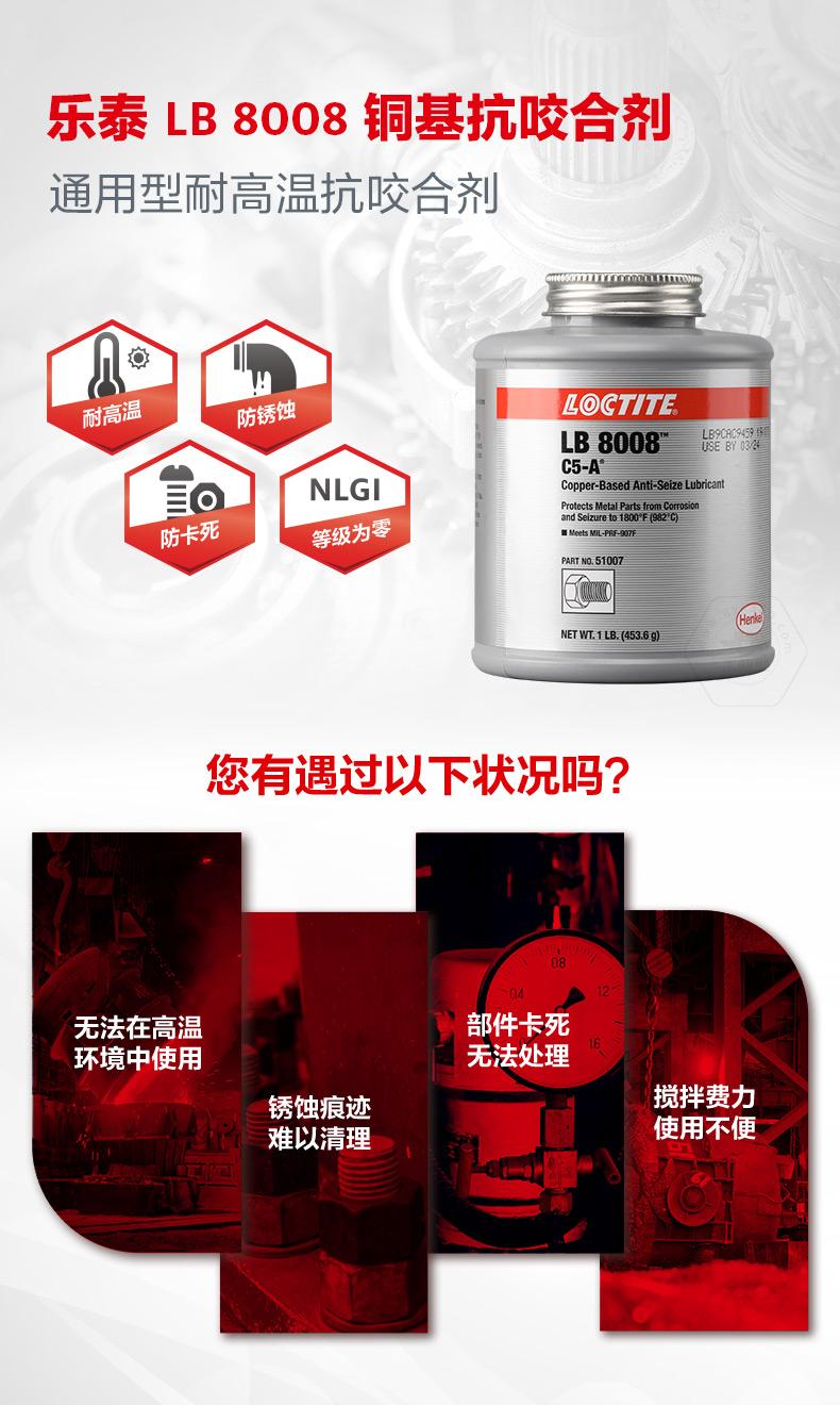 乐泰LB8008铜基抗咬合剂是一款通用型耐高温抗咬合剂。乐泰LB8008铜基抗咬合剂耐温可达982℃,具备防锈蚀、防卡死、NLGI等级为0等特点。乐泰LB8008铜基抗咬合剂适用于高负载和极端环境,可帮助避免咬合破损、延长设备寿命、减少意外停机。乐泰LB8008铜基抗咬合剂自带顶刷并可自动搅拌,操作更简便,适用于采矿、发电、石化、铁路、水处理等行业。