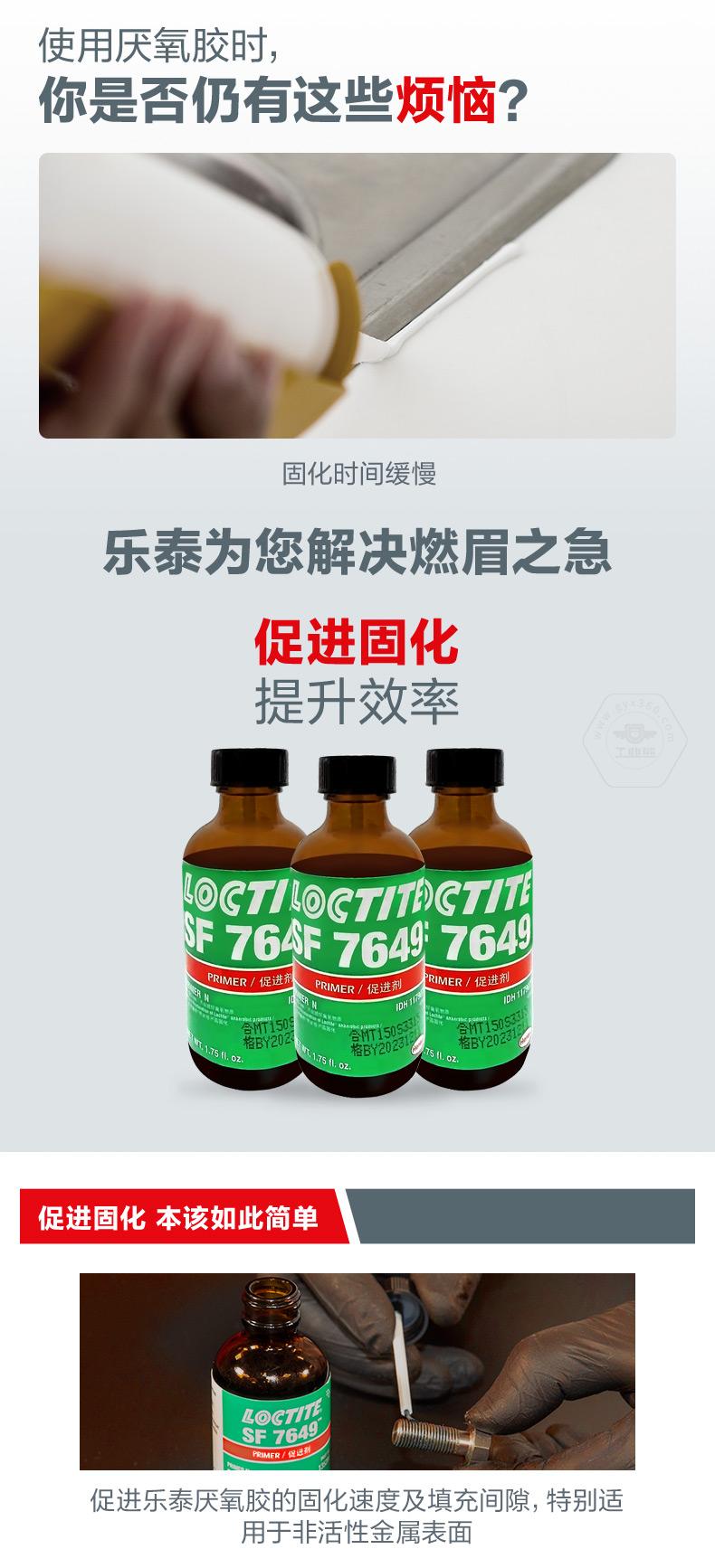 乐泰SF7649是一款用于表面处理、促进固化的溶剂型促进剂。乐泰SF7649适用于惰性金属表面,可促进乐泰厌氧胶在非活性金属表面的固化速度,并兼顾大间隙填充需求。对于需要加快固化速度、间隙较大,或一般在10℃以下使用促进剂的场景,乐泰SF7649更有针对性。乐泰SF7649规格为1.75oz和4.5oz,外观为透明、绿色,溶剂类型为丙酮,溶剂挥发时间30-70秒,粘度2mPa·s,在件寿命≤30天,质保期18个月(8-21℃阴凉干燥处)。